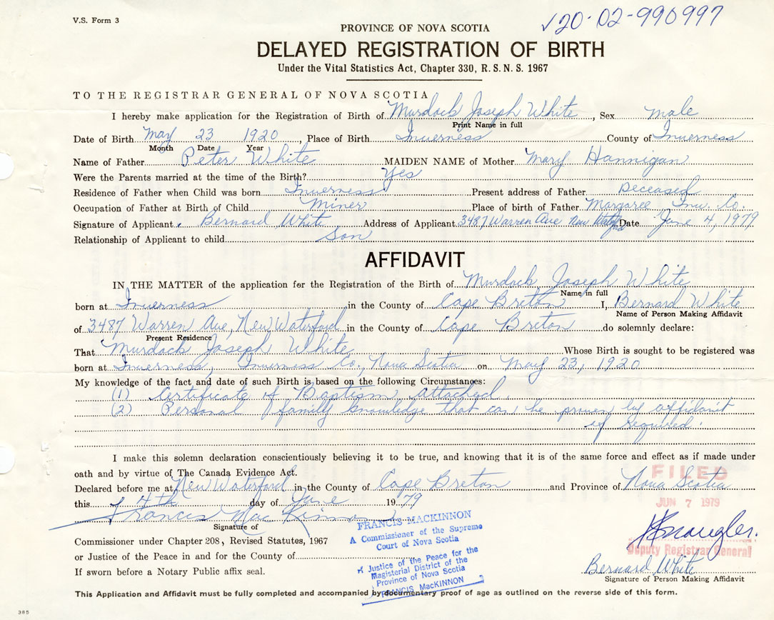 Signature of Applicant Bernard White Address of Applicant New Waterford Date June 4, 1979