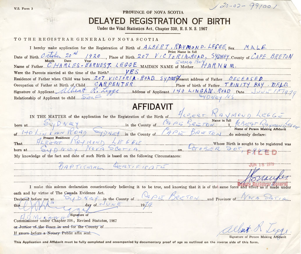 Date of Birth October 20, 1920 Place of Birth SydneyCounty of Cape Breton