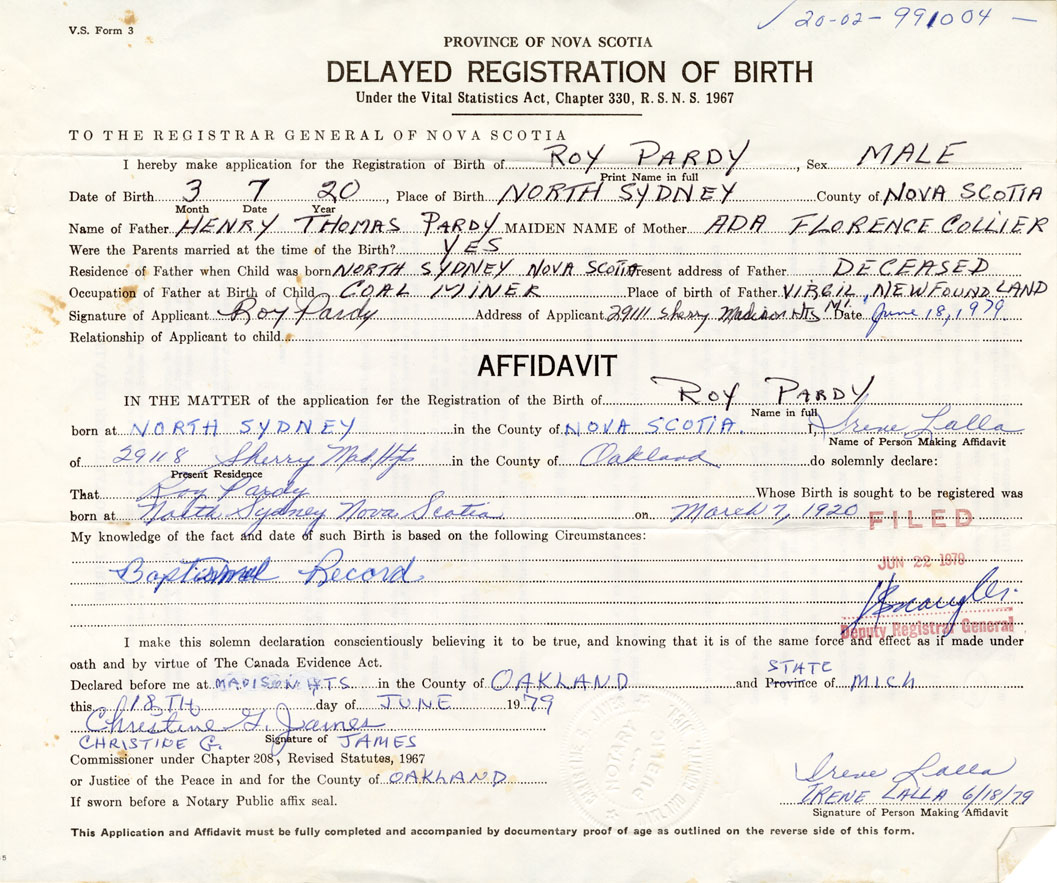 I hereby make application for the Registration of Birth of RoyPardy Sex Male