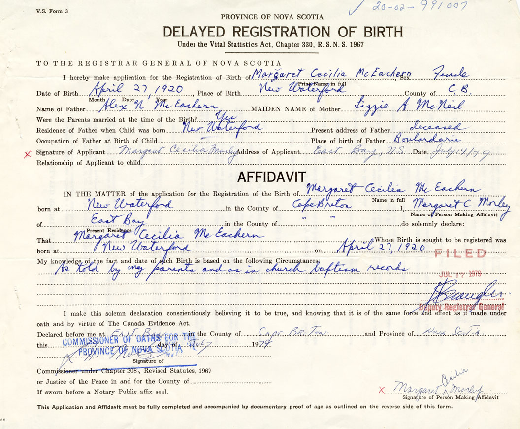 I hereby make application for the Registration of Birth of Margaret CeciliaMcEachern Sex Female