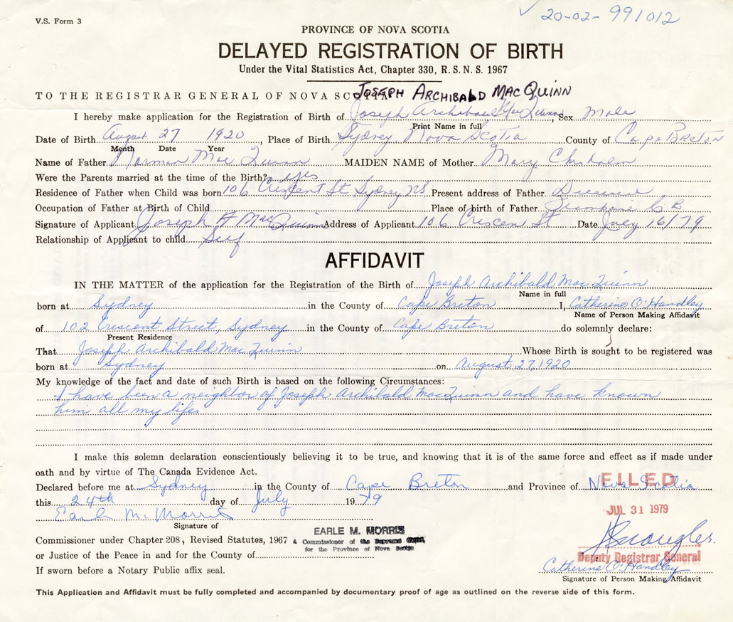 I hereby make application for the Registration of Birth of Joseph ArchibaldMacQuinn Sex Male