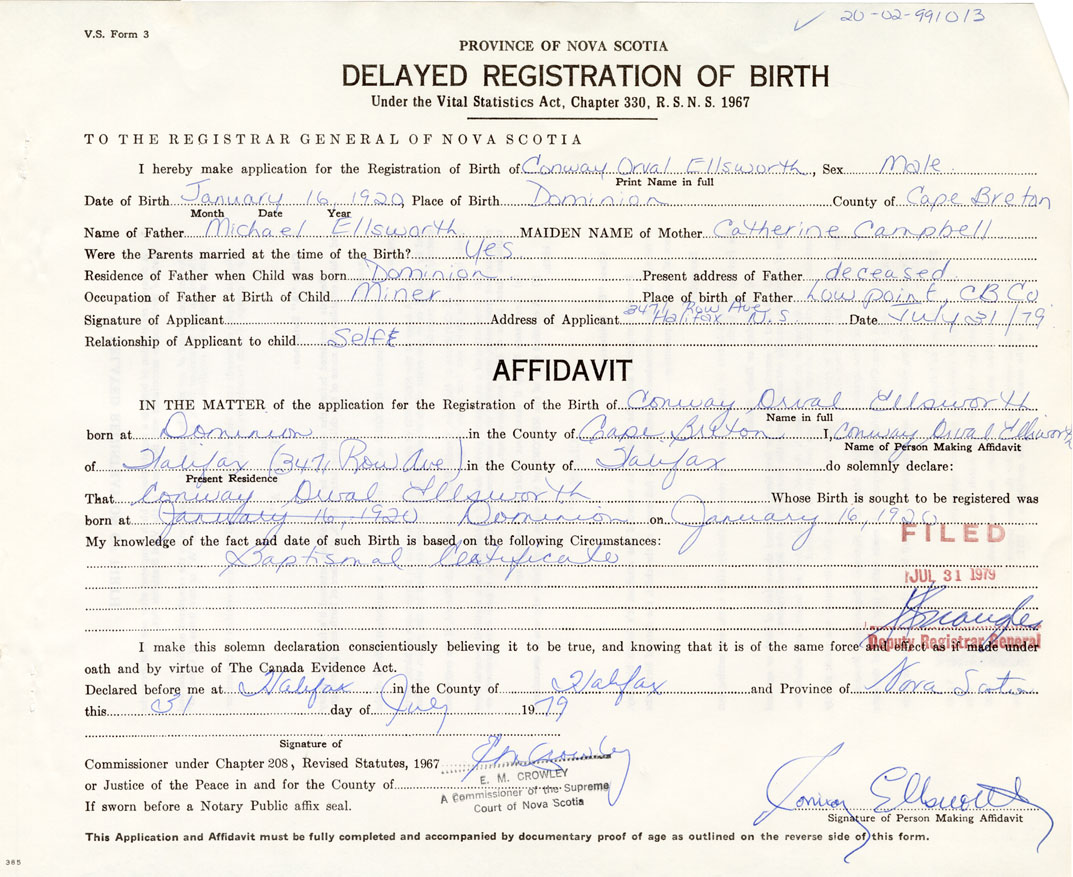 Signature of Applicant Conway Orval Ellsworth Address of Applicant Halifax Date July 31, 1979