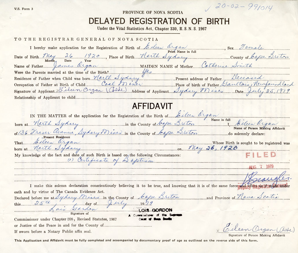Signature of Applicant Eileen OrganAshe Address of Applicant Sydney Mines Date July 25, 1979