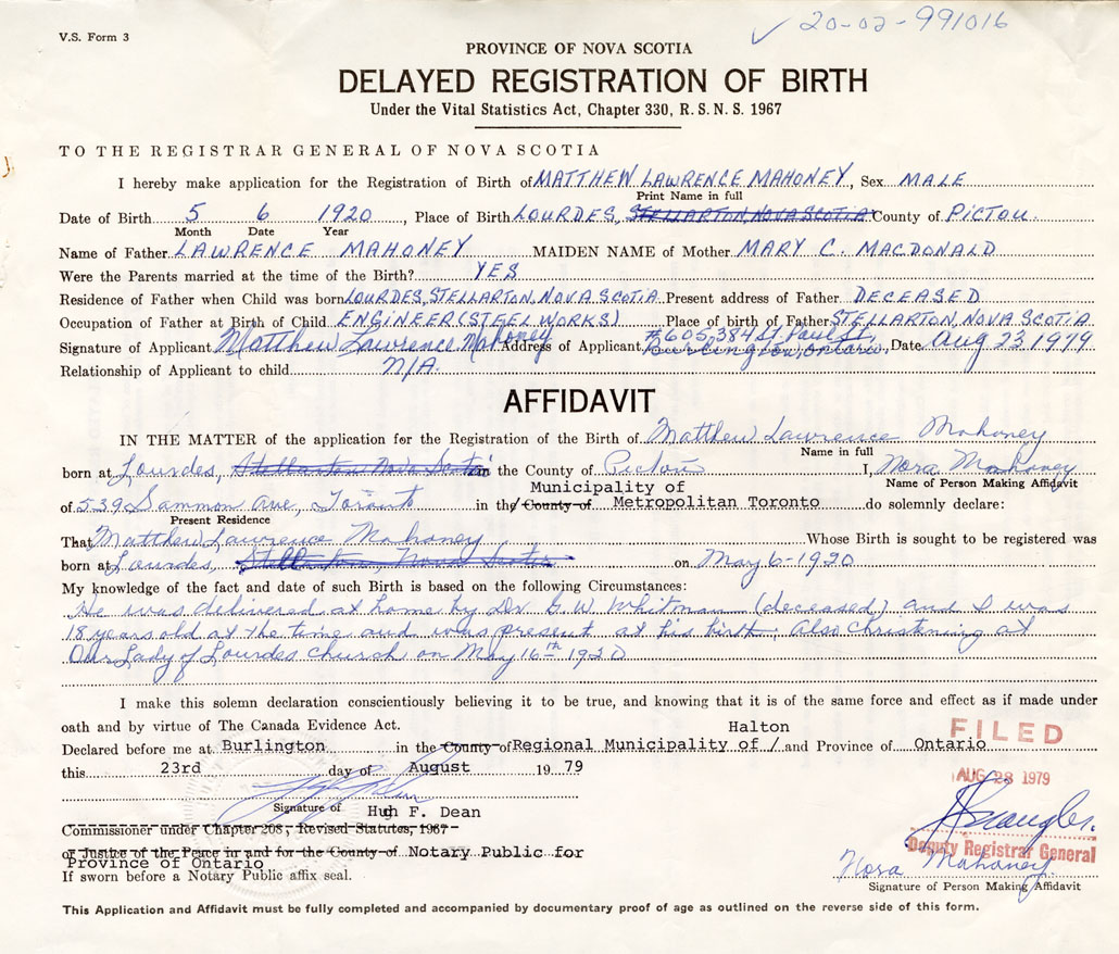 Date of Birth May 6, 1920 Place of Birth LourdesCounty of Pictou