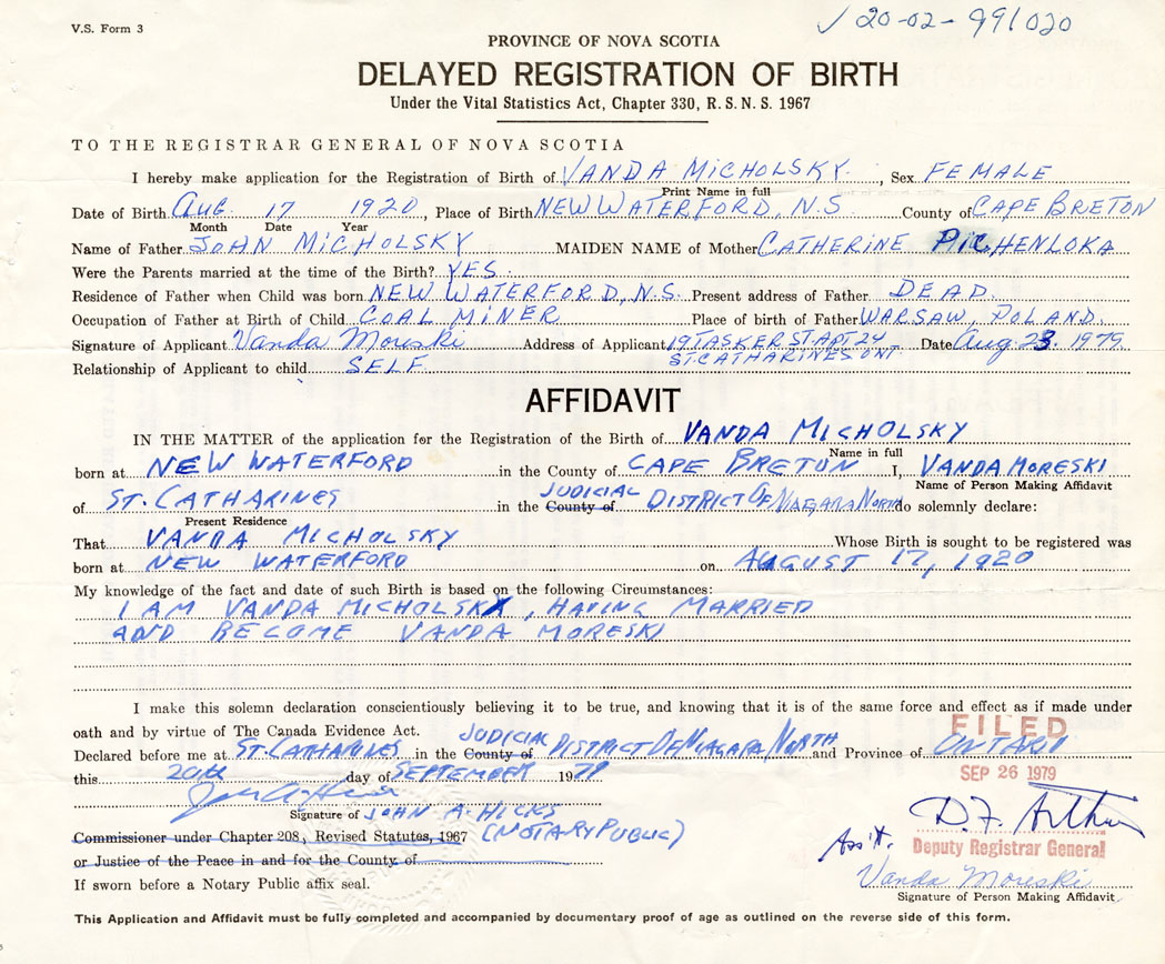 IN THE MATTER of the application for the Registration of the Birth of Vanda Micholsky