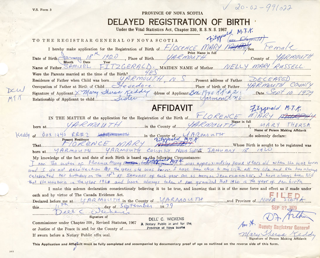 I am the sister of Florence Mary Fitzgerald and was approximately four years old when she was born and I [have no] recollection of the year she was born. I have been close to my sister all my life and she has always celebrated her birthday on the 18th of January of each year. For as long as I can remember. I have always been told that she was born in the year 1920 and have always taken it for granted that 1920 is the year of her birth.