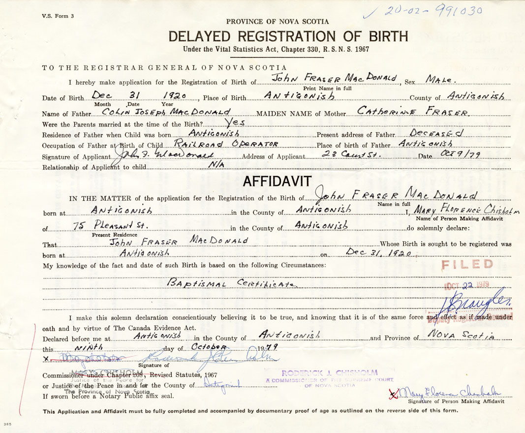 Date of Birth December 31, 1920 Place of Birth AntigonishCounty of Antigonish