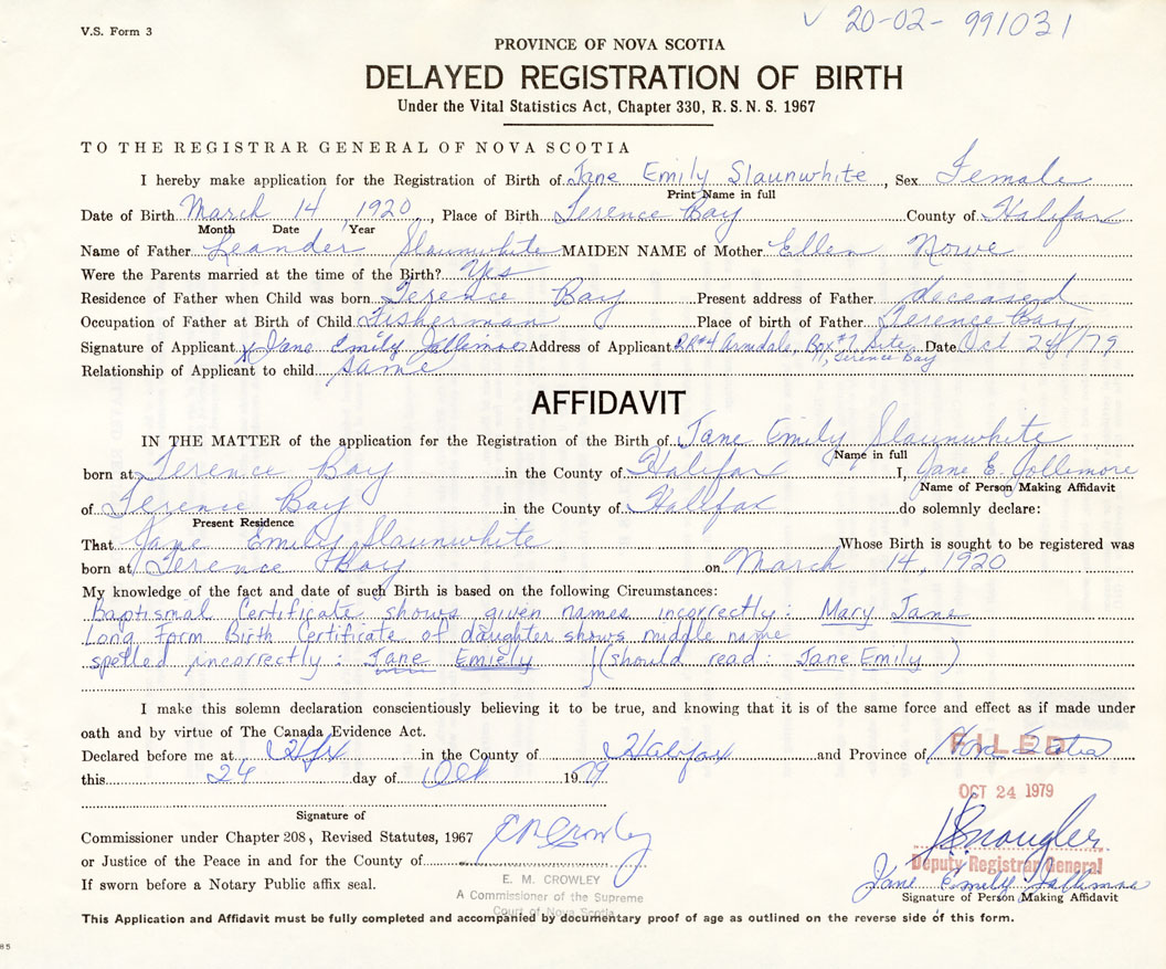 Signature of Applicant Jane Emily Jollimore Address of Applicant Terence Bay Date October 24, 1979
