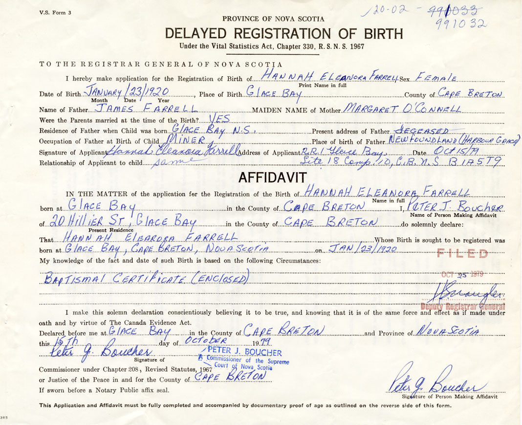 Signature of Applicant Hannah Eleanora Farrell Address of Applicant Glace Bay Date October 15, 1979