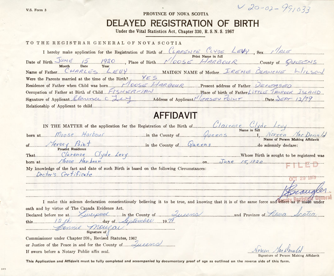 I hereby make application for the Registration of Birth of Clarence ClydeLevy Sex Male
