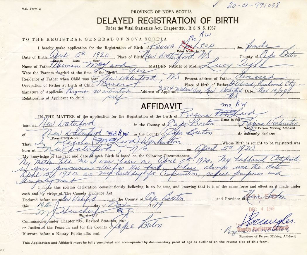 Signature of Applicant Regina Warburton Address of Applicant New Waterford Date November 19, 1979