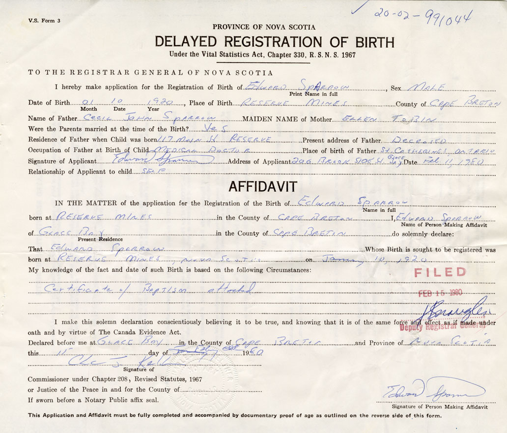 Date of Birth January 10, 1920 Place of Birth Reserve MinesCounty of Cape Breton