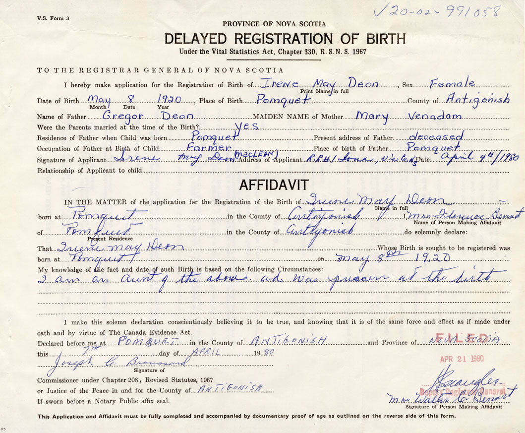 Date of Birth May 8, 1920 Place of Birth PomquetCounty of Antigonish