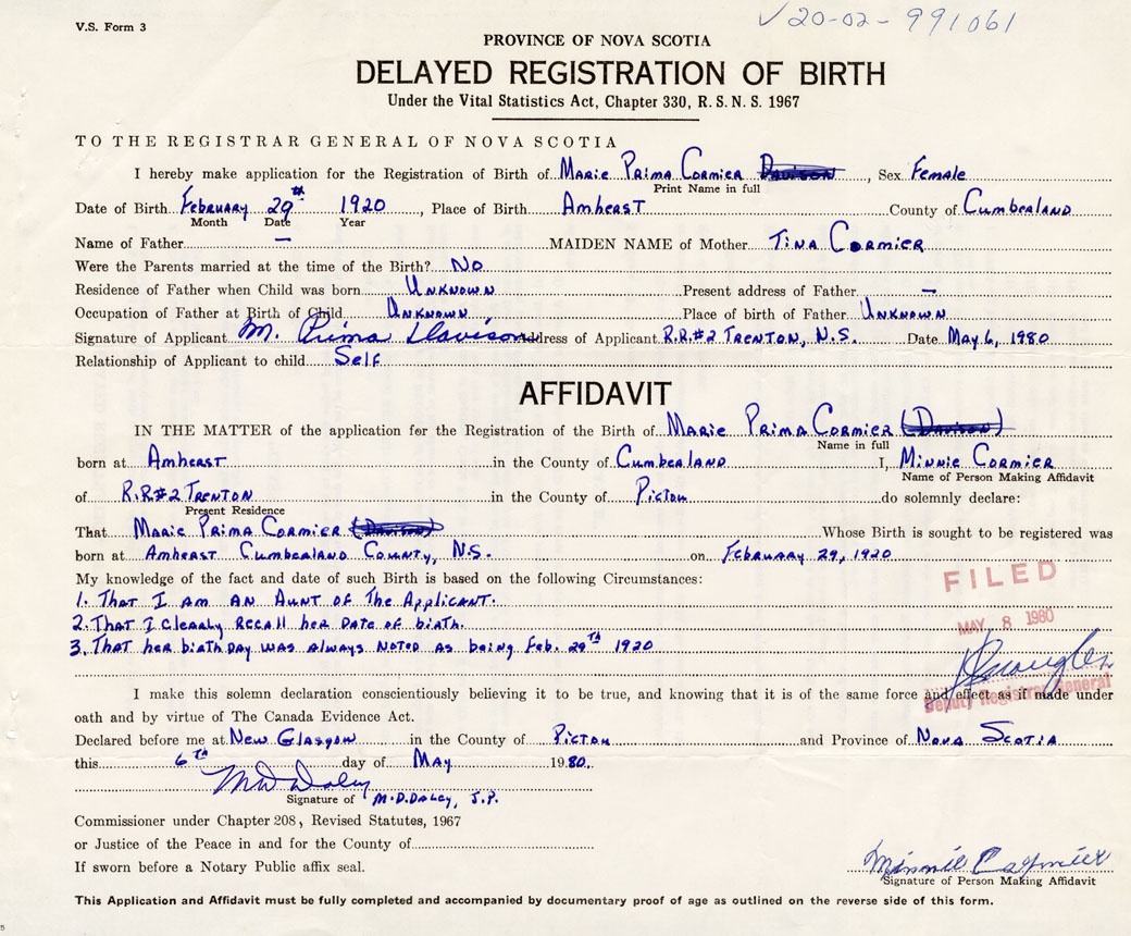 Date of Birth February 29, 1920 Place of Birth AmherstCounty of Cumberland