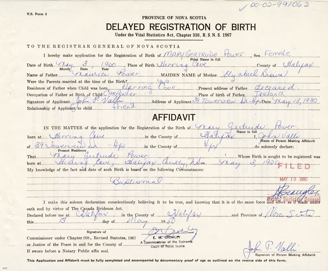 Date of Birth May 3, 1920 Place of Birth Herring CoveCounty of Halifax