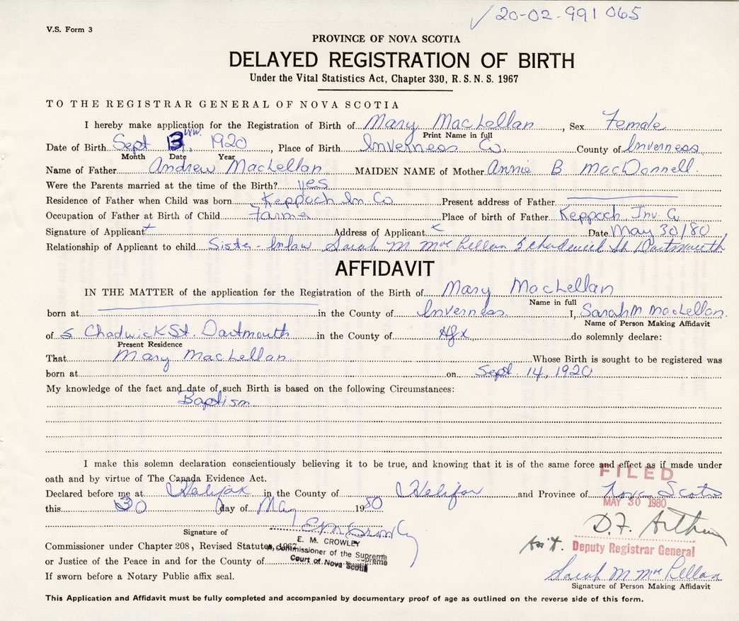 Date of Birth September 13, 1920 Place of Birth Inverness Co.County of Inverness