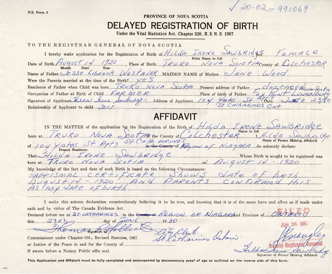 IN THE MATTER of the application for the Registration of the Birth of Hilda IreneWestaver (Sawbridge)