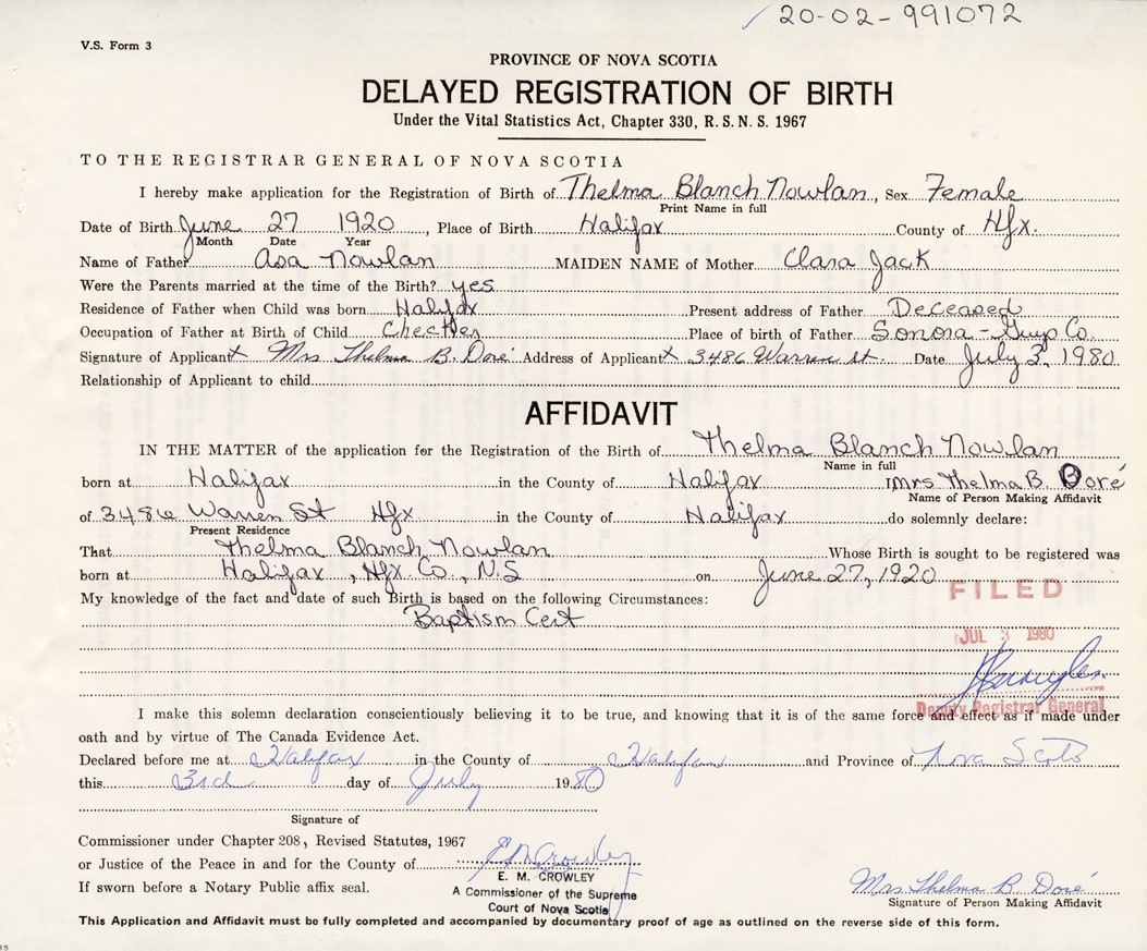 Signature of Applicant Mrs. Thelma B. Dove Address of Applicant 3486 Warren Street, Halifax Date 3 July 1980