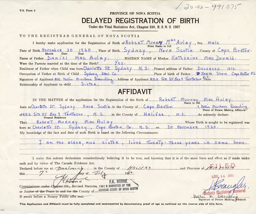 Date of Birth November 30, 1920 Place of Birth SydneyCounty of Cape Breton