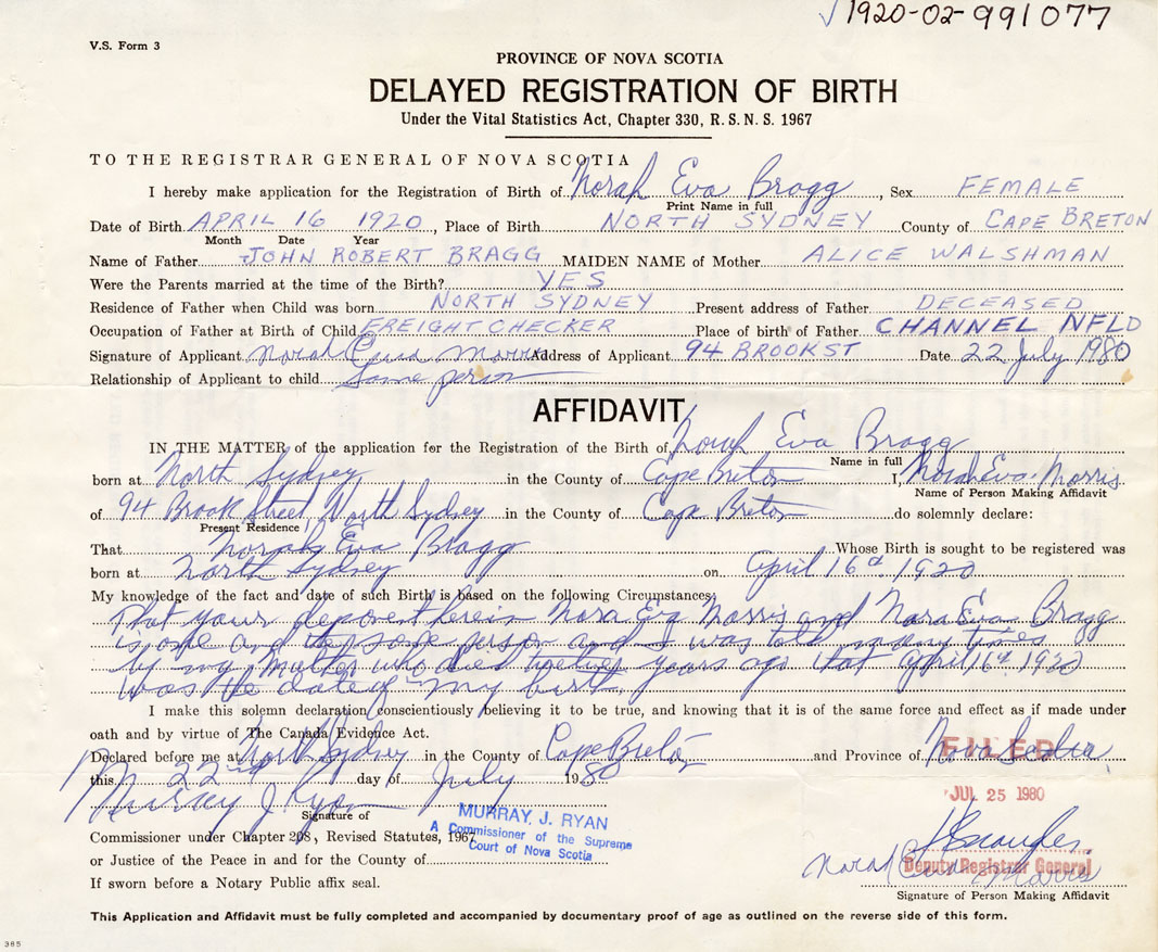 Date of Birth April 16, 1920 Place of Birth North SydneyCounty of Cape Breton