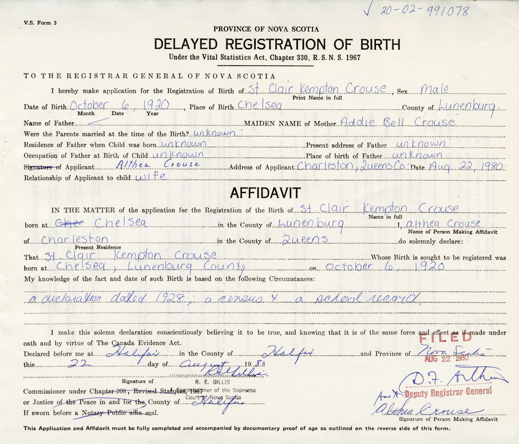 I hereby make application for the Registration of Birth of St. Clair KemptonCrouse Sex Male