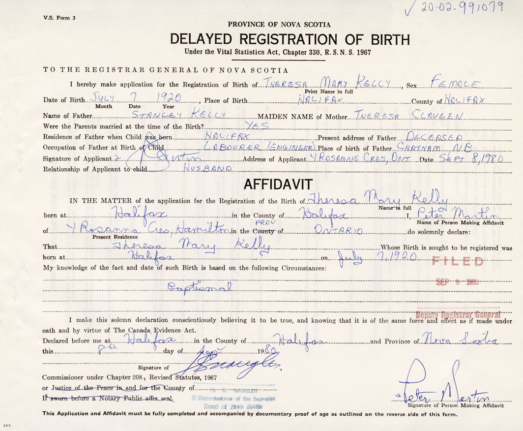 IN THE MATTER of the application for the Registration of the Birth of Theresa MaryKelly