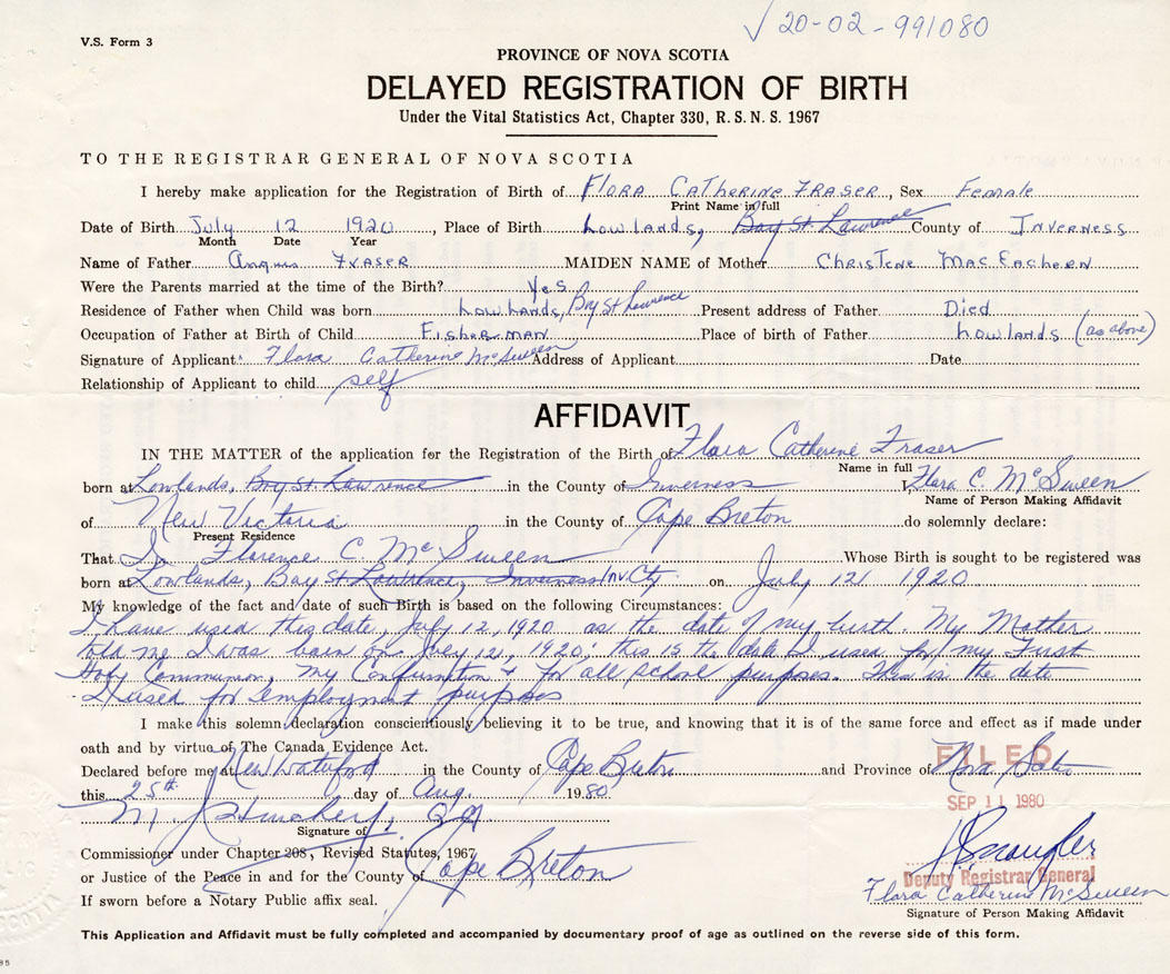 Residence of Father when child was born Lowlands, Bay St. Lawrence, Inverness Co. Present address of Father deceased