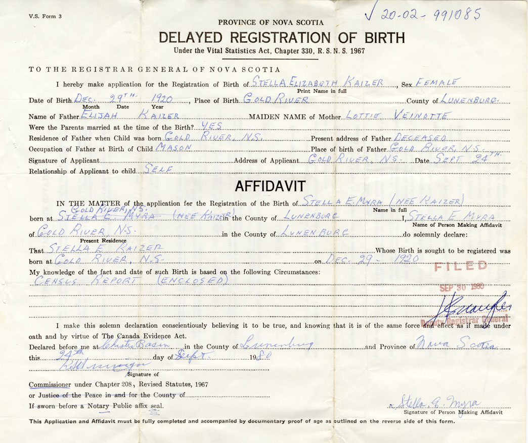 Date of Birth December 29, 1920 Place of Birth Gold RiverCounty of Lunenburg