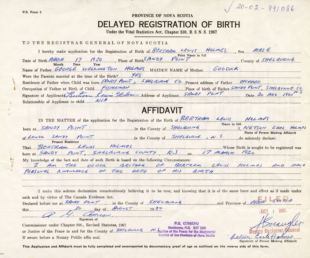 Signature of Applicant Bertram Lewis Holmes Address of Applicant Sandy Point, Shelburne Co. Date 30 August 1980