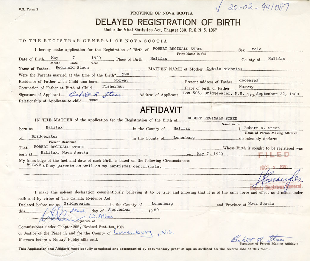 I hereby make application for the Registration of Birth of Robert ReginaldSteen Sex Male