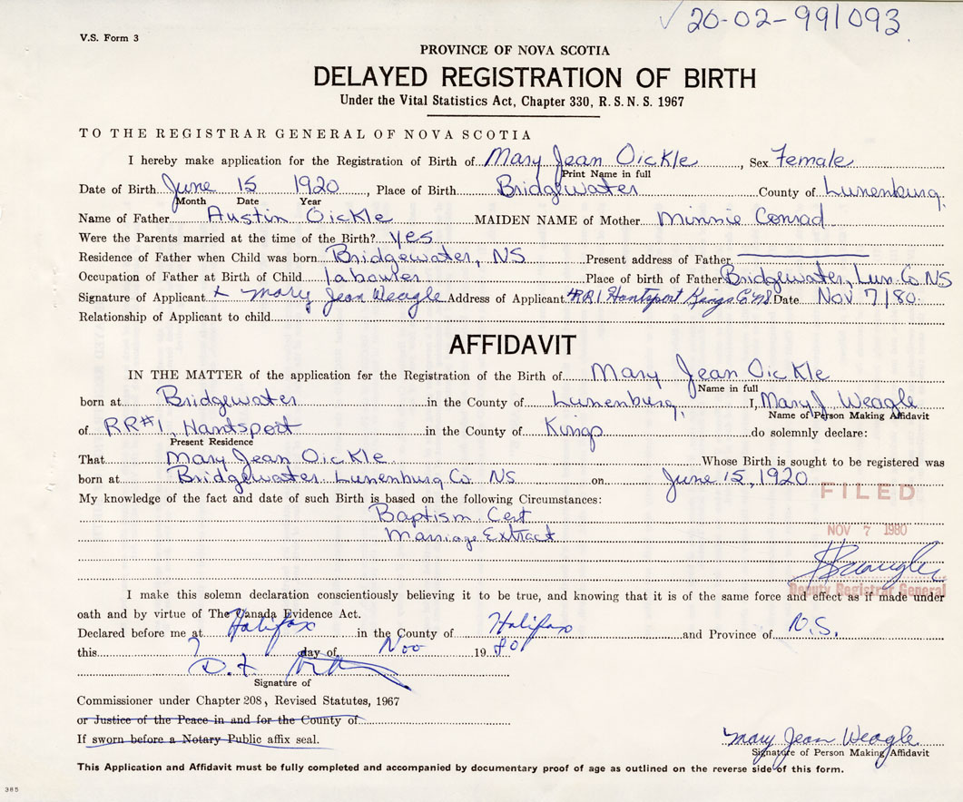 Signature of Applicant Mary Jean Weagle Address of Applicant RR #1, Hantsport, Kings Co. Date 7 November 1980