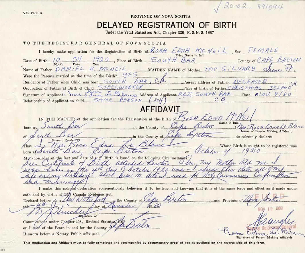Signature of Applicant Mrs. Rosa Edna LeBlanc Address of Applicant RR #1, South Bar, Cape Breton Co. Date 4 November 1980