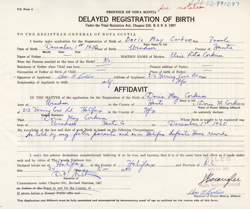 IN THE MATTER of the application for the Registration of the Birth of Doris MayComeau (Corkum)