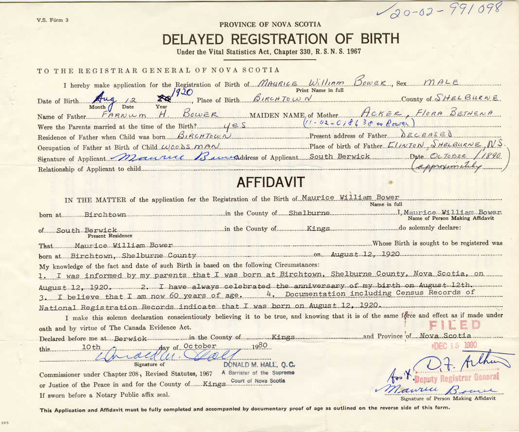 1. I was informed by my parents that I was born at Birchtown, Shelburne County, on August 12, 1920. 2. I have always celebrated the anniversary of my birth on August 12th. 3. I believe that I am now 60 years of age. 4. Documentation including Census Records of National Registration Records indicate that I was born on August 12, 1920.