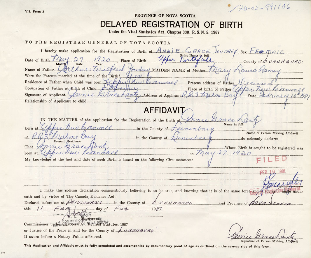 Signature of Applicant Annie Grace Lantz Address of Applicant R.R. #3, Mahone Bay Date February 12, 1981