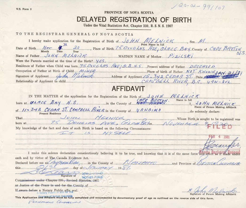 Date of Birth November 4, 1920 Place of Birth Glace BayCounty of Cape Breton