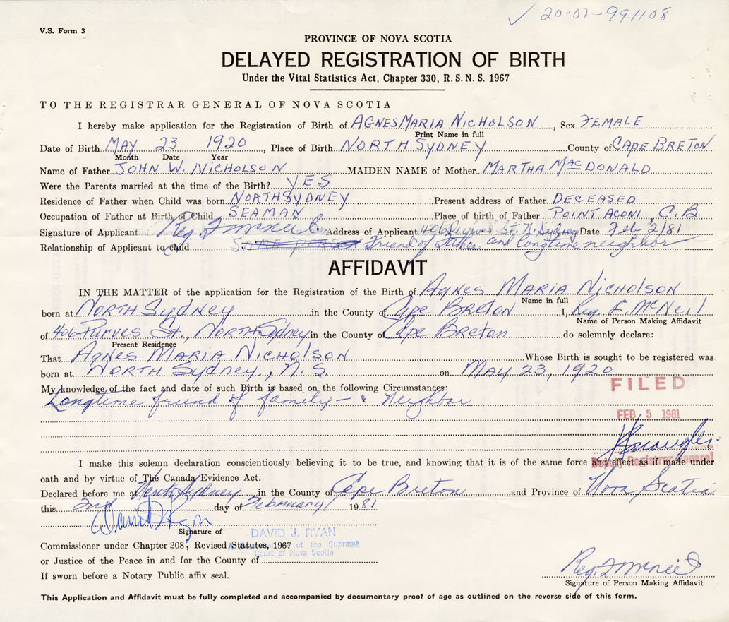 Date of Birth May 23, 1920 Place of Birth North SydneyCounty of Cape Breton