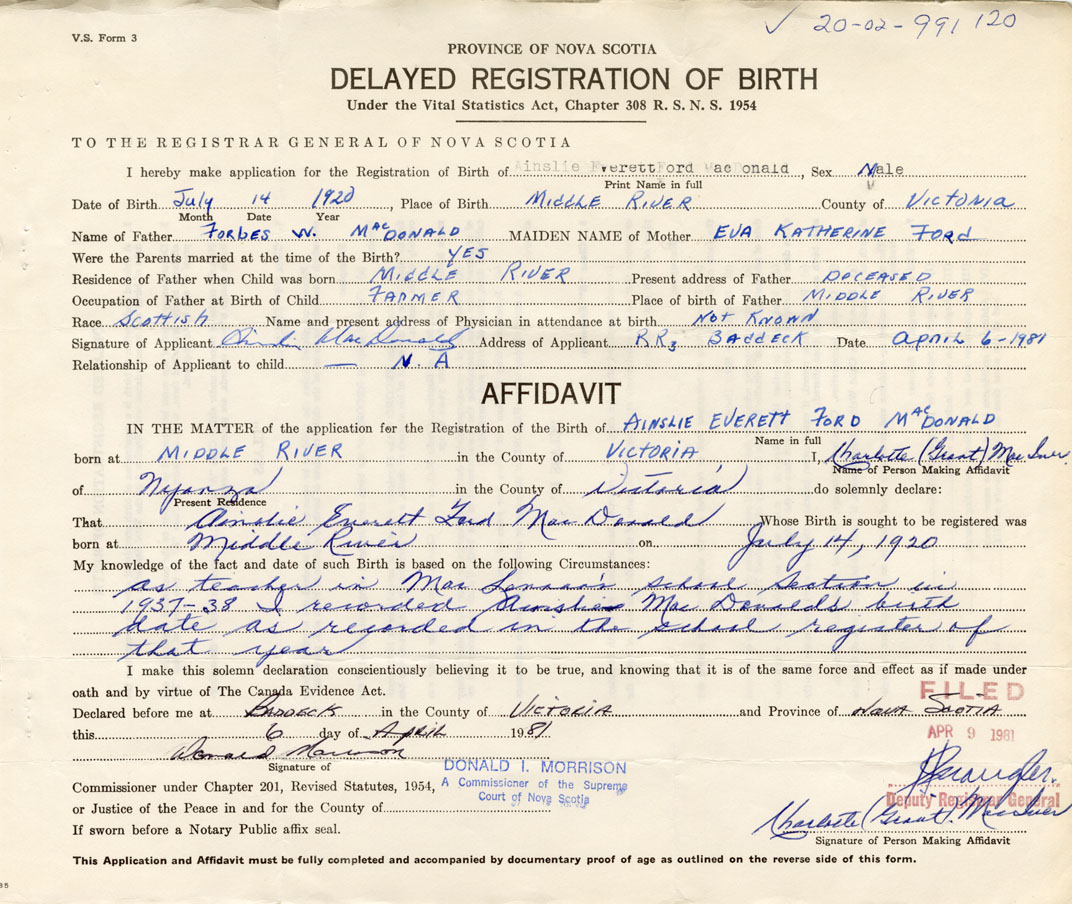 That Ainslie Everett FordMacDonald Whose Birth is sought to be registered was