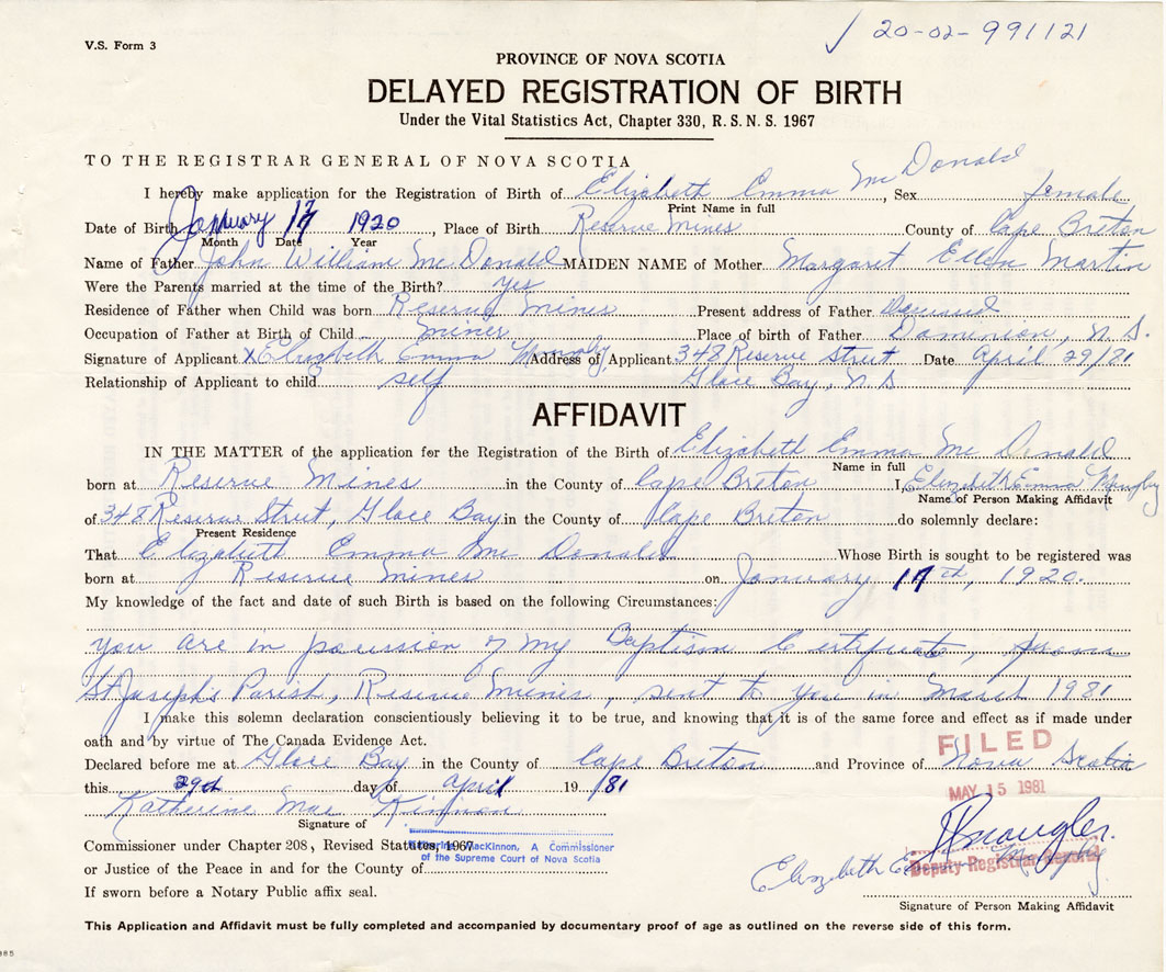 Date of Birth January 17, 1920 Place of Birth Reserve MinesCounty of Cape Breton