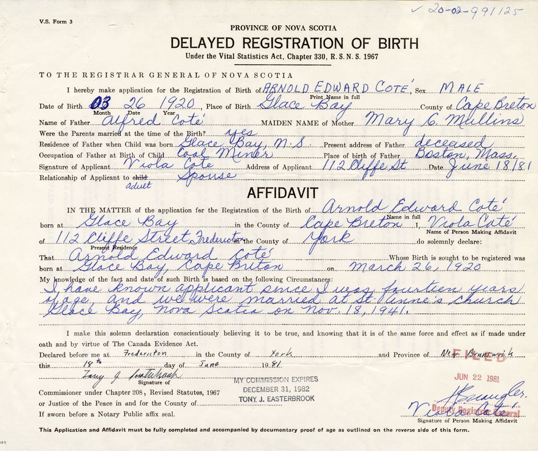 I hereby make application for the Registration of Birth of Arnold EdwardCote Sex