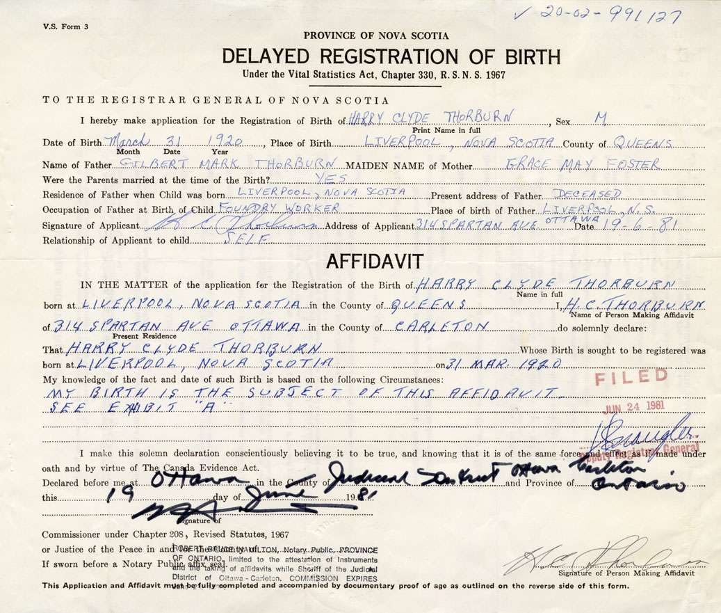 I hereby make application for the Registration of Birth of Harry ClydeThorburn Sex