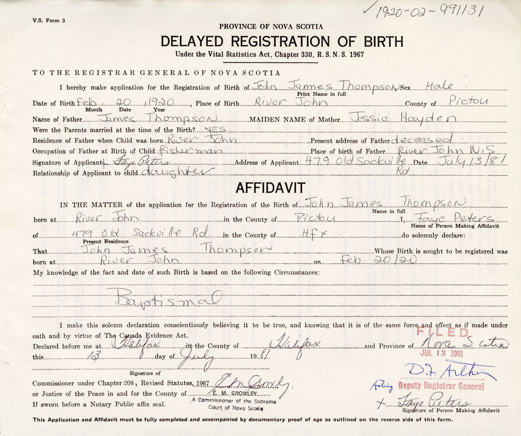 Date of Birth February 20, 1920 Place of Birth River JohnCounty of Pictou