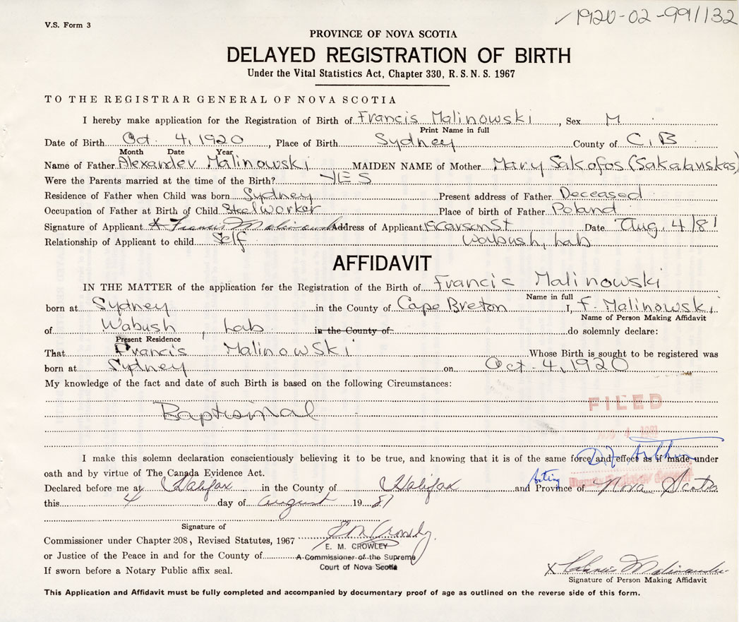 I hereby make application for the Registration of Birth of FrancisMalinowski Sex Male
