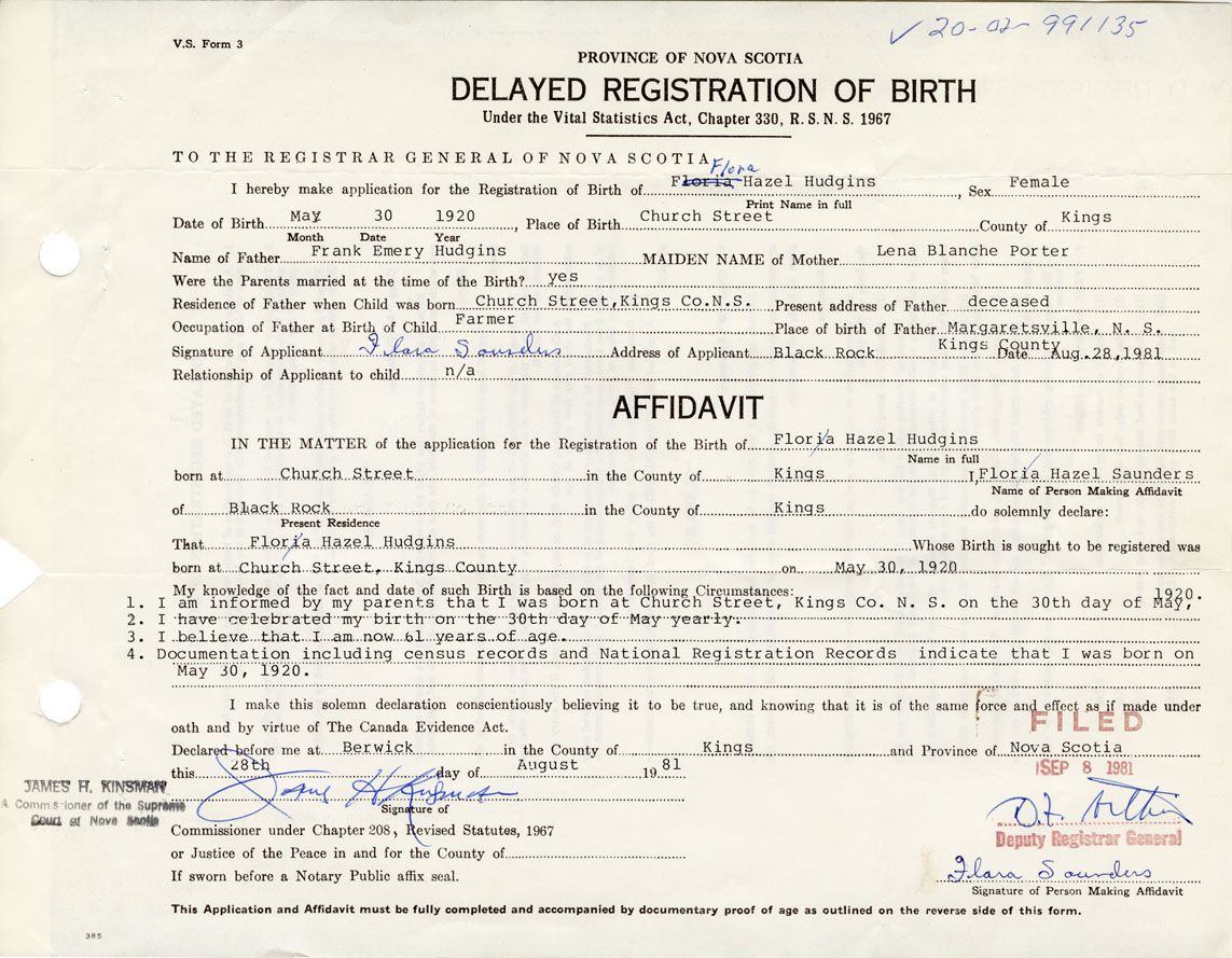 1. I am informed by my parents that I was born at Church Street, Kings Co. NS on the 30th day of 1920. 2. I have celebrated my birth on the 30th day of May yearly. 3. I believe that I am now 61 years of age. 4. Documentation including census records and National Registration records indicate that I was born on May 30, 1920.