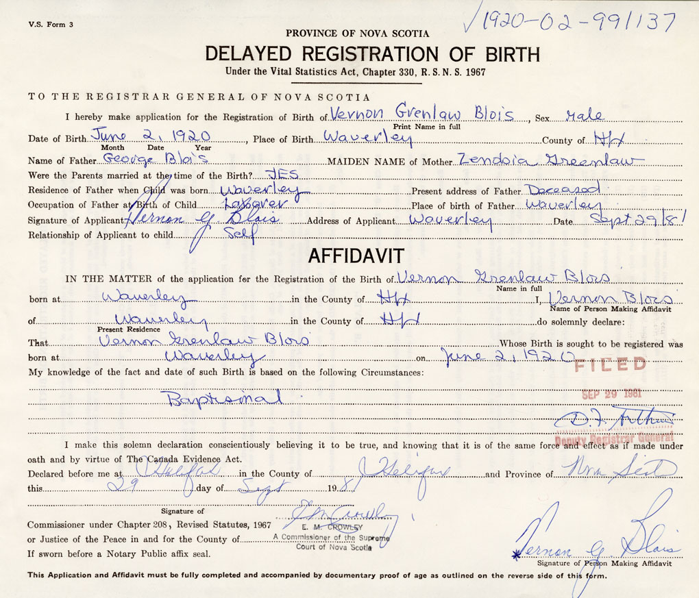 Signature of Applicant Vernon G. Blois Address of Applicant Waverley, Halifax Date 29 September 1981