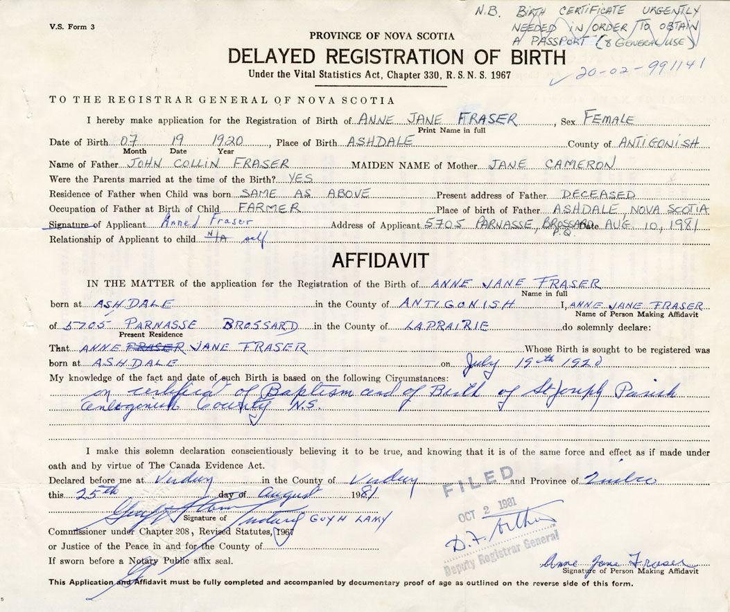 Date of Birth July 19, 1920 Place of Birth AshdaleCounty of Antigonish