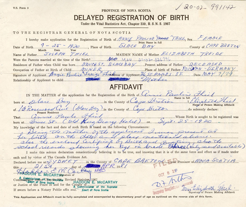 Date of Birth September 25, 1920 Place of Birth Glace BayCounty of Cape Breton