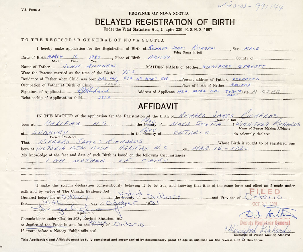 Signature of Applicant R.J. Richards Address of Applicant 192 A Alton Ave., Toronto, Ont. Date October 14, 1981