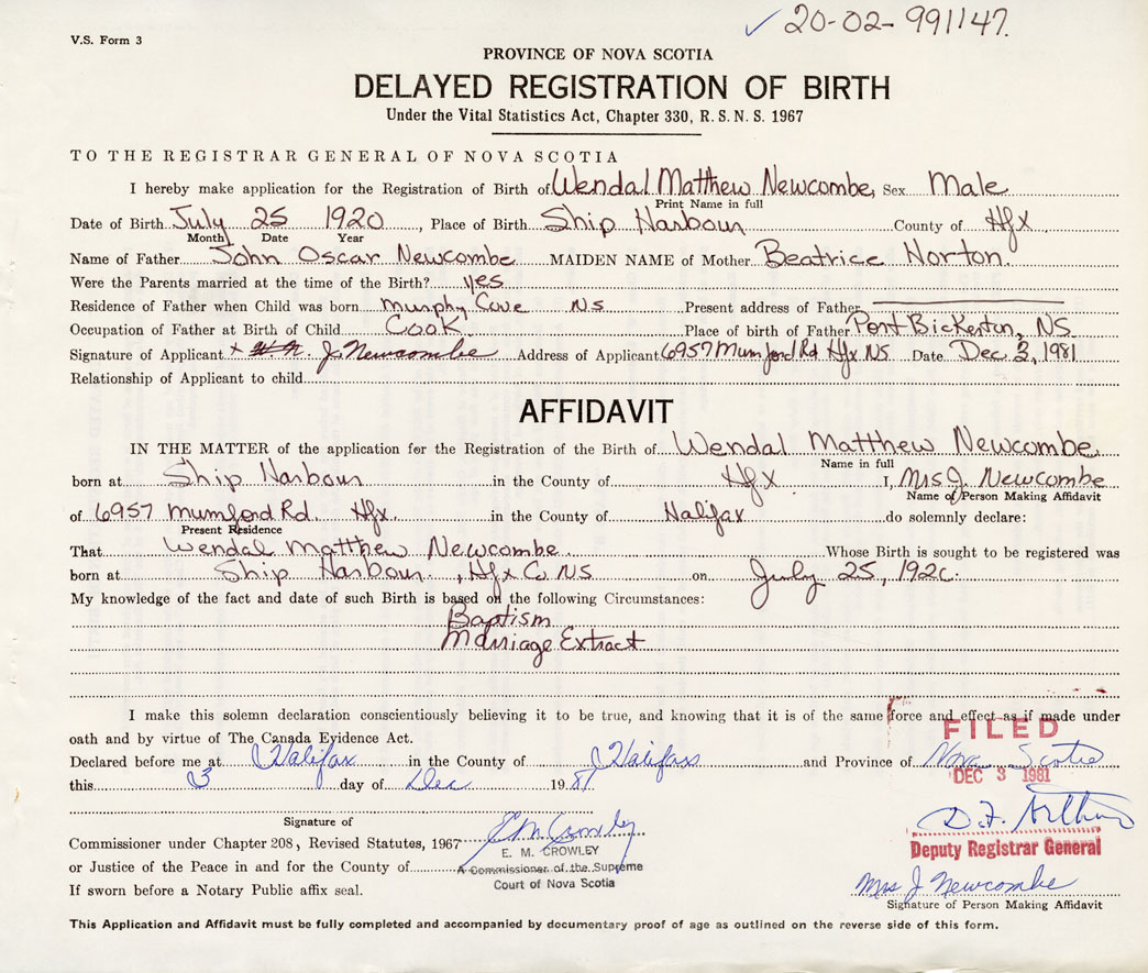 born at Ship Harbour Halifax County on July 25, 1920