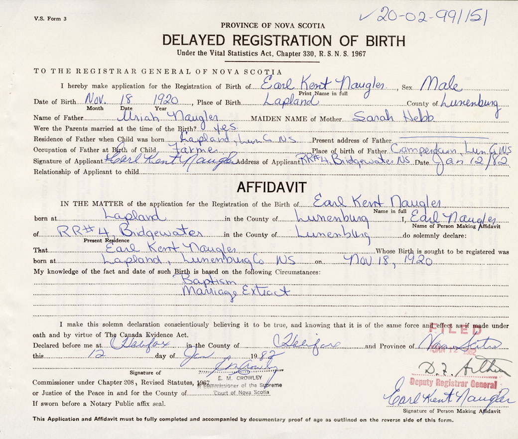 Date of Birth November 18, 1920 Place of Birth LaplandCounty of Lunenburg